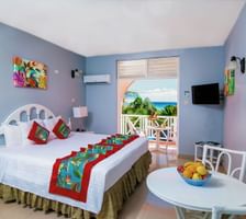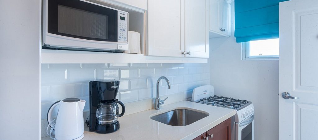 Our newly renovated Premium Studio with Sea View apartment is air-conditioned and offers a private balcony with a stunning view of the St. Lawrence Bay. Elegantly finished with porcelain tiles, granite counter tops and a flat screen TV, this room is complete with a king-sized bed, double sofa bed, kitchenette (each equipped with fridge, stove, microwave, toaster & coffeemaker) telephone, room safe, clock with iPod docking station and daily maid service. FREE WIFI and air-conditioning in this room. This studio can sleep 3 people – kids 11 and under stay free.