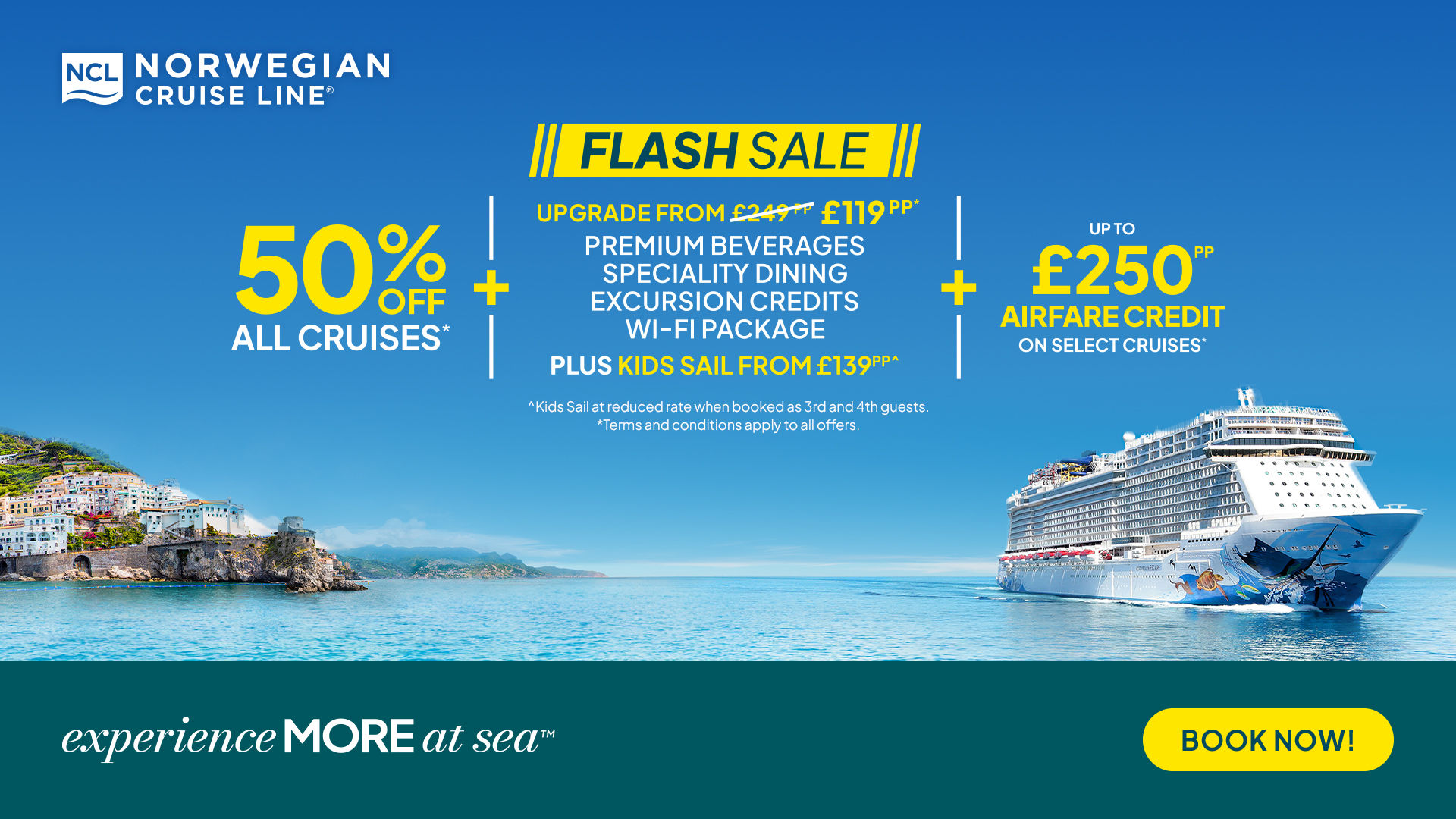 Up to 50% off ALL Cruises!Plus, your customers can enjoy our cruising upgrade package More At Sea™ for half price £249 £119pp!