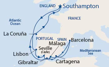 𝙋𝙤𝙧𝙩𝙨: Southampton 🔸 Lisbon, Portugal 🔸 Seville (Cadiz), Spain 🔸 Cartagena, Spain 🔸 Barcelona, Spain 🔸 Malaga, Spain 🔸 Gibraltar 🔸 La Coruna, Spain (for Santiago de Compostela) 🔸 Southampton