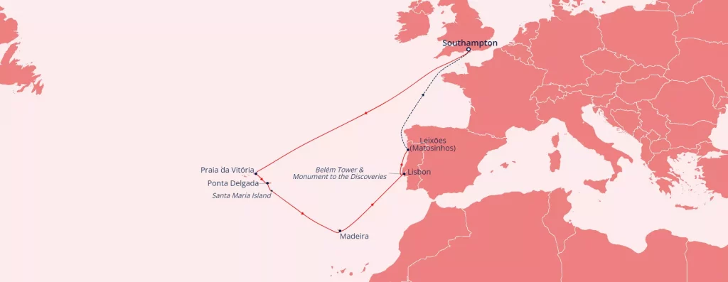 🛳️⚓️Southampton – cruising – Praia da Vitoria, Terceira, Azores – Ponta Delgada, São Miguel, Azores – Cruise by Santa Maria, Azores – Cruising – Funchal, Madeira, Portugal – Cruising – Cruise mouth of River Tagus – Lisbon, Portugal – Leixões, Matosinhos, Portugal – cruising – Southampton⚓️🛳️